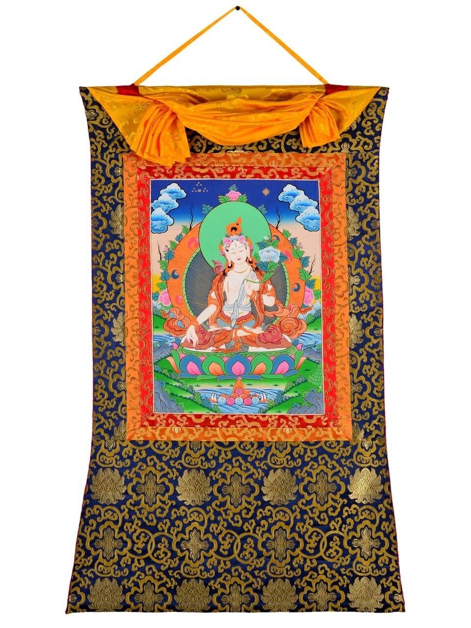 Tibetischer Thangka - Weiße Tara. Thangkagröße außen mit Brokatrahmen Breite 72 cm - Länge 112 cm. Bildergröße innen 37 cm X 50 cm handgemalt mit Ölfarben auf Leinwand.